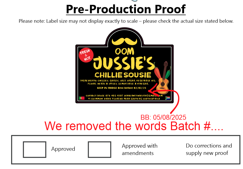 Oom Jussie Chilli Sousie Front Labels, size 52 x 68 mm Best Before ....